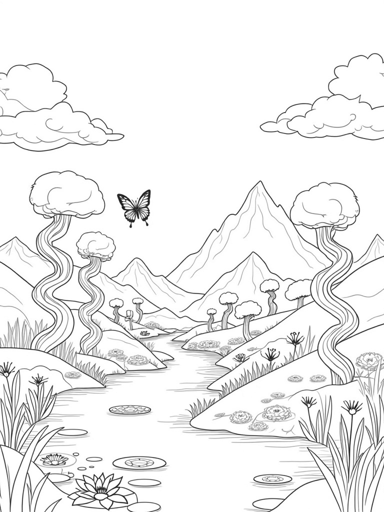 In the distance, you can see a majestic mountain range with jagged peaks that touch swirling clouds. It’s a striking contrast to the soft curves of the valley below. And if you look closely, you’ll spot giant, patterned butterflies fluttering above vibrant wildflowers, adding a touch of whimsy to this tranquil landscape. Perfect for a relaxing coloring session!