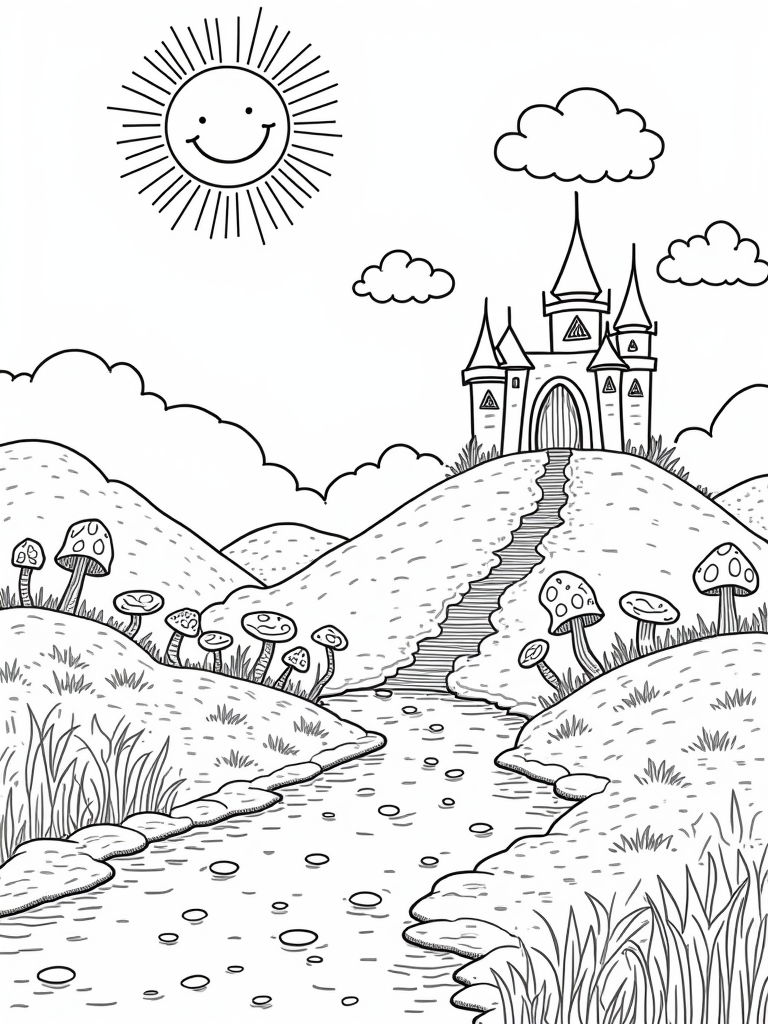If you look closely, you’ll notice a cluster of oversized mushrooms acting as a natural bridge over the river. On the other side, a group of happy rocks sit in fun shapes, ready to add some personality to your coloring. And let’s not forget the pathway made of rainbow-colored pebbles leading to a sweet candy castle, complete with candy cane towers and a gumdrop door. It’s like stepping right into a fairy tale!