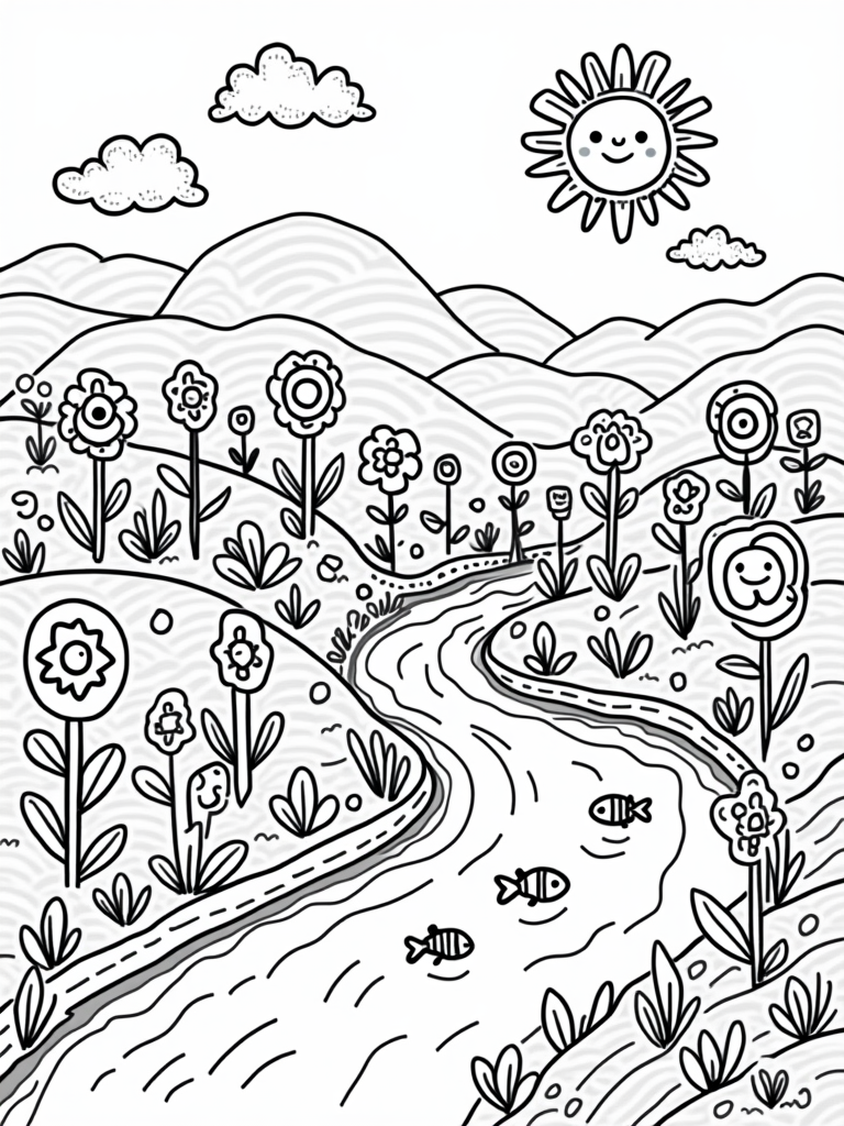You’ll find a delightful landscape filled with rolling hills that are sprinkled with huge, colorful flowers shaped like playful geometric patterns. A winding river meanders through the scene, and if you look closely, you might spot some cheerful fish leaping joyfully above the water. The riverbanks are lined with smooth pebbles, making it a perfect spot for a little picnic!
