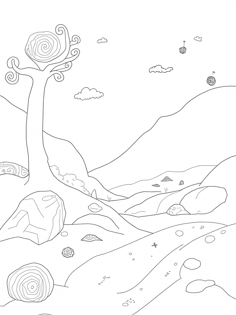 This scene is like something out of a dream! You'll find oversized, swirling hills that look like they're dancing, with a giant spiraled tree sitting proudly at the top. Its branches reach high into the sky, and the leaves—wait for it—are shaped like musical notes! How cool is that? The landscape is dotted with huge, geometric rocks that have swirling patterns, adding to the fantastical vibe.