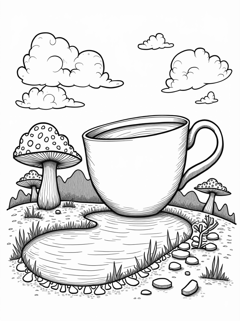 Check out this free, printable coloring page featuring a surreal landscape with a giant teacup, oversized mushrooms, and a whimsical tree. Perfect for kids and adults alike, it's a fun way to unwind and let your creativity flow!