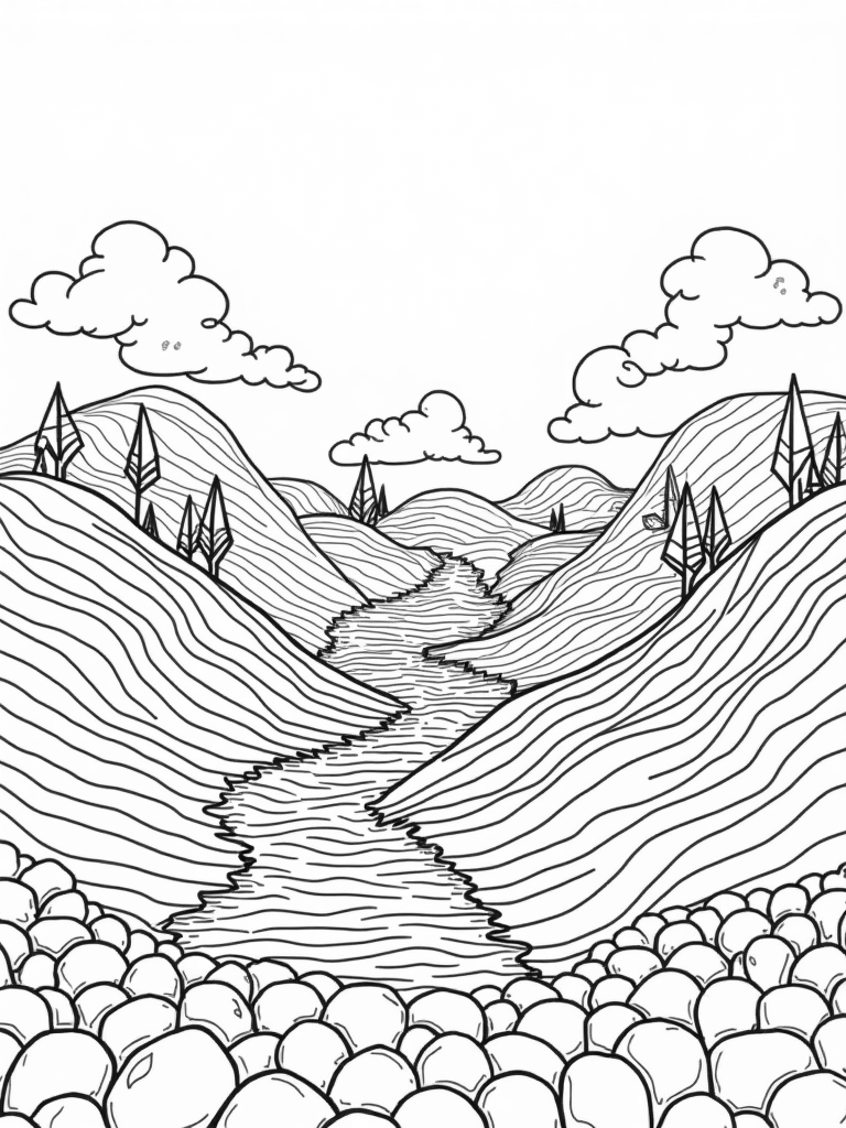 In the foreground, oversized pebbles create a stunning mosaic of geometric patterns just waiting for your favorite colors. Fluffy clouds shaped like pillows drift lazily overhead, casting soft shadows on the hills below. You can choose bright colors for the hills and trees, or maybe go for a dreamy pastel palette. It's all up to you!