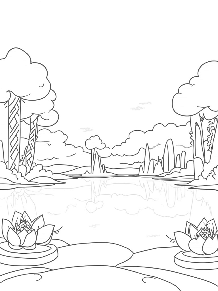 Check out this free, printable coloring page of a tranquil lake scene! Perfect for adults who love landscapes, it features geometric trees, floating islands, and a beautiful lotus flower. Grab your colors and bring this peaceful image to life!