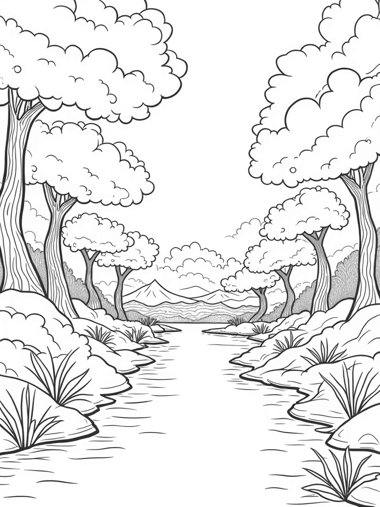 Tranquil Valley with Cotton Candy Clouds Coloring Page