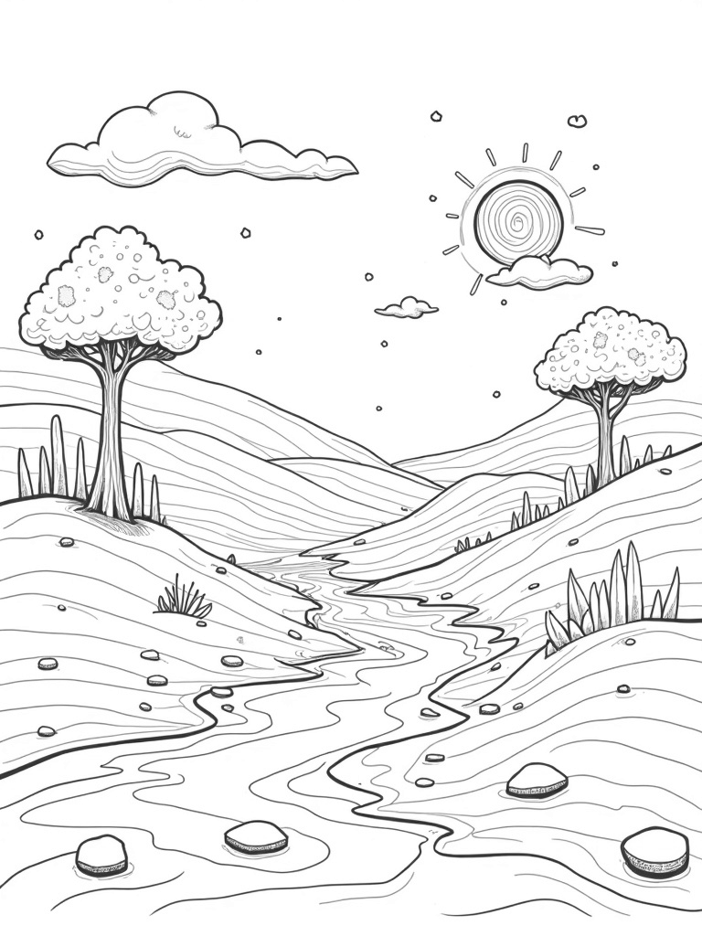 As you gaze into the distance, you'll spot a radiant sun made from a mosaic of vibrant hues, casting a warm glow over this whimsical landscape. It’s a perfect scene for kids to fill with their creativity and let their imaginations shine.