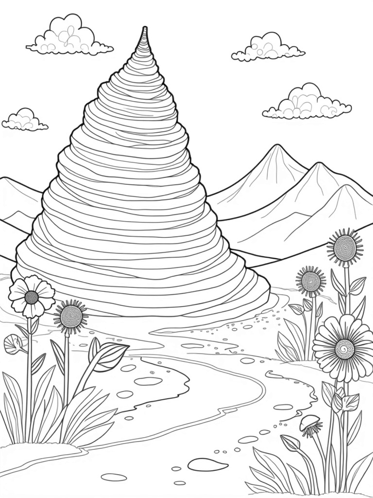Check out this free, printable coloring page featuring a serene landscape with a giant ice cream hill and oversized flowers. Perfect for kids and adults alike, it's a fun way to relax and get creative!