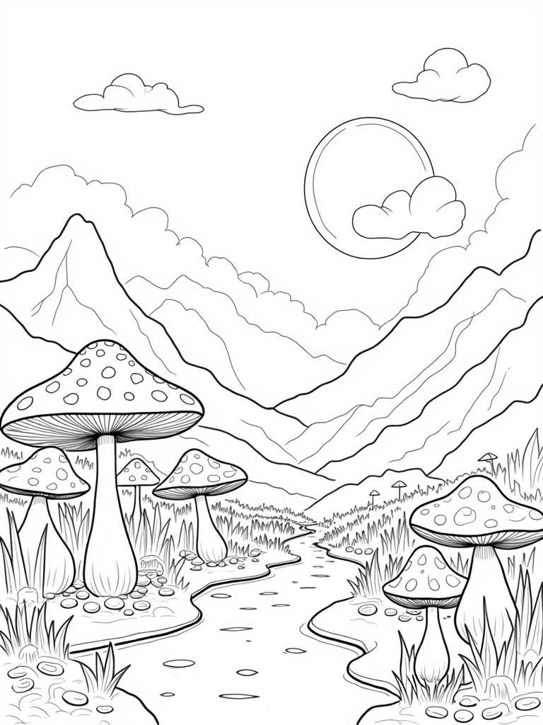 Whimsical Valley with Umbrella Flowers and Toadstools Coloring Page