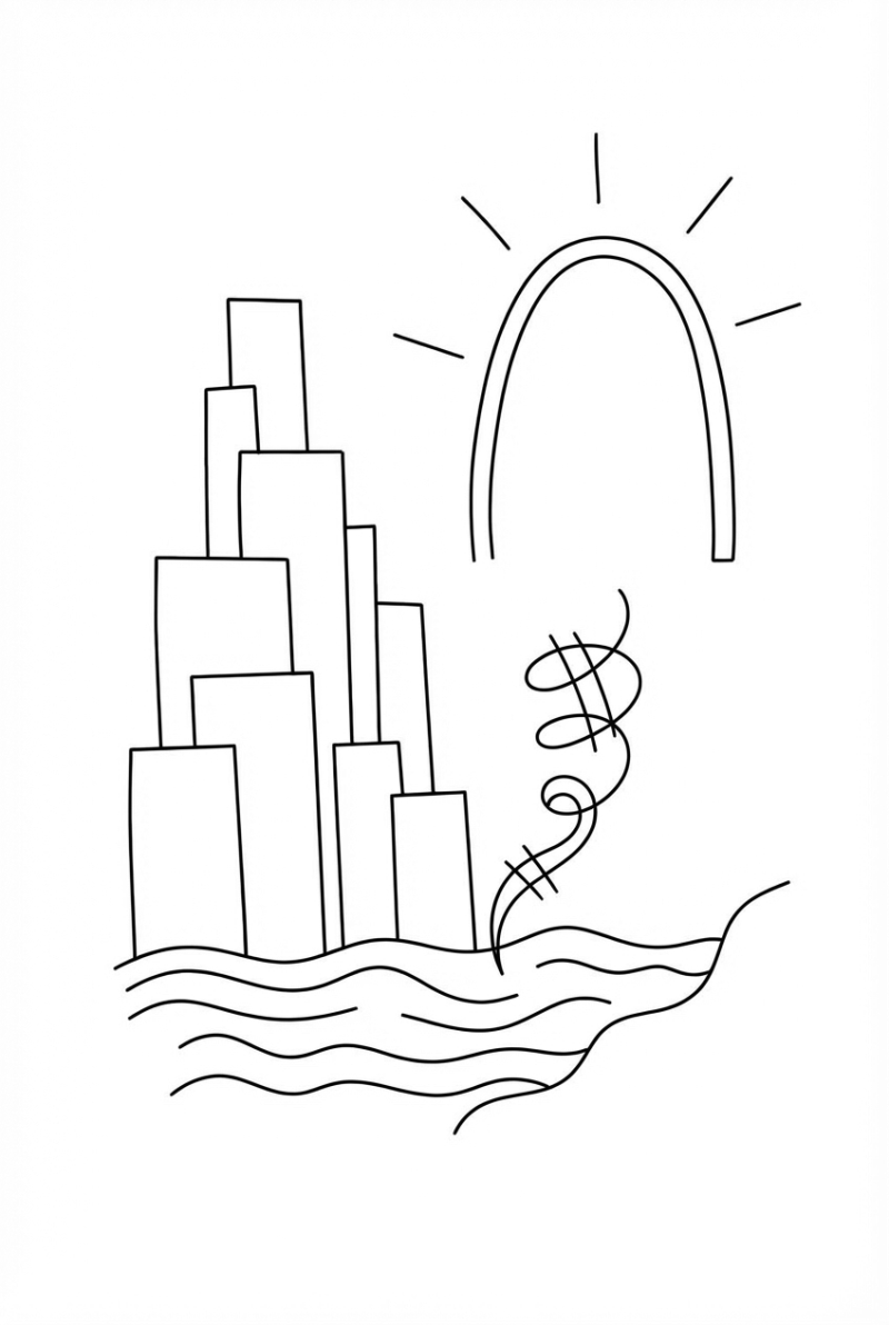 Picture a crisp black‑line drawing of a deep basalt canyon split into neat, stepped terraces. At the bottom a smooth lake looks like liquid silver, hugging the rocks like a calm mirror. From the lake’s edge climbs a spiraling staircase made of petrified wood, each rung a simple curve that whispers “climb me.” In the far sky a massive sandstone arch glows faintly from inside, giving the whole scene a quiet, magical vibe.