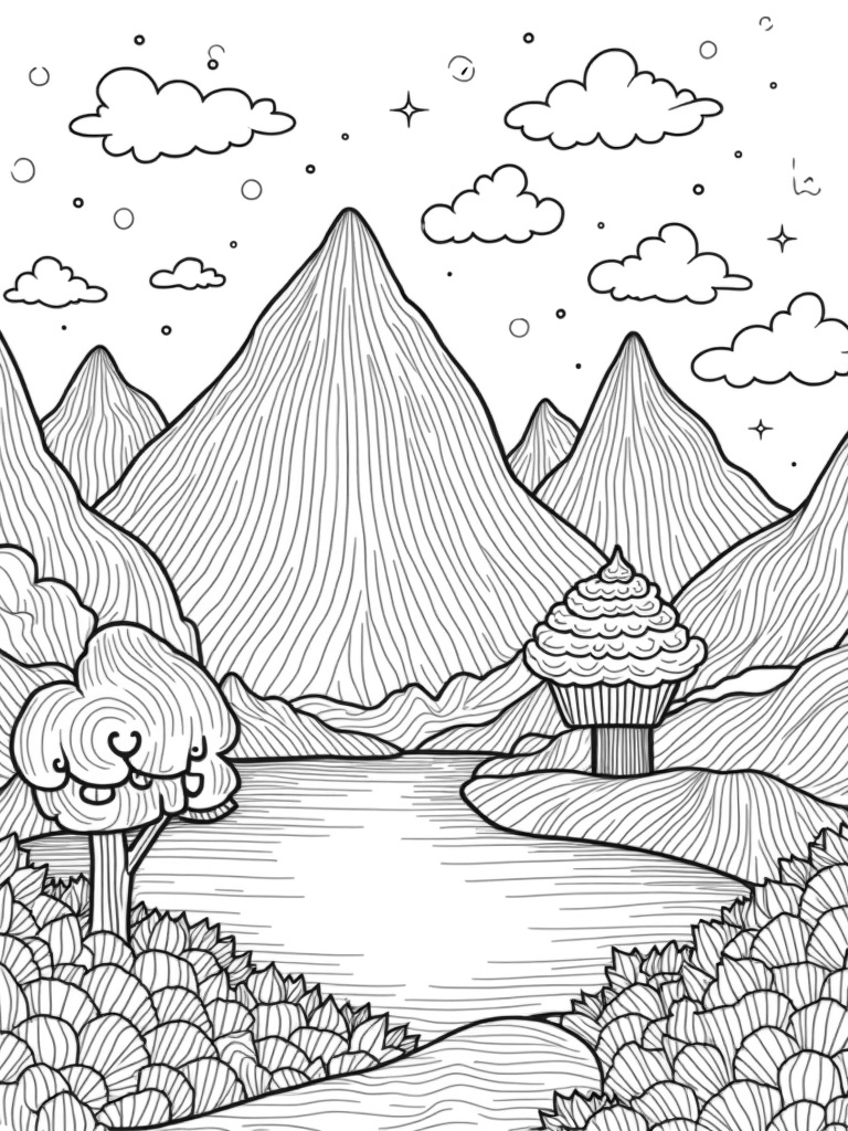 And right nearby, there’s a small island that’s home to a gigantic cupcake tree. Its frosting flows like a waterfall, making it the perfect spot for some yummy imagination. What flavor do you think it is? Chocolate, vanilla, or maybe strawberry? Just picture yourself sitting under that tree with a big smile!