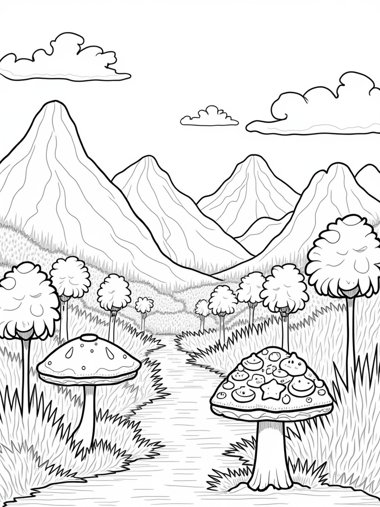 Check out this free, printable coloring page featuring a whimsical landscape with candy-colored trees, a giant mushroom table, and fluffy animal-shaped clouds. Perfect for kids who love colorful adventures in a magical valley!