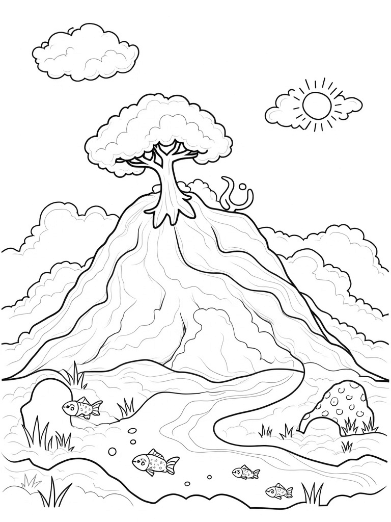 Enjoy this free, printable coloring page featuring a dreamy landscape of a cloud hill, a twisted tree, and playful geometric fish. Perfect for kids who love to color and explore imaginative worlds!