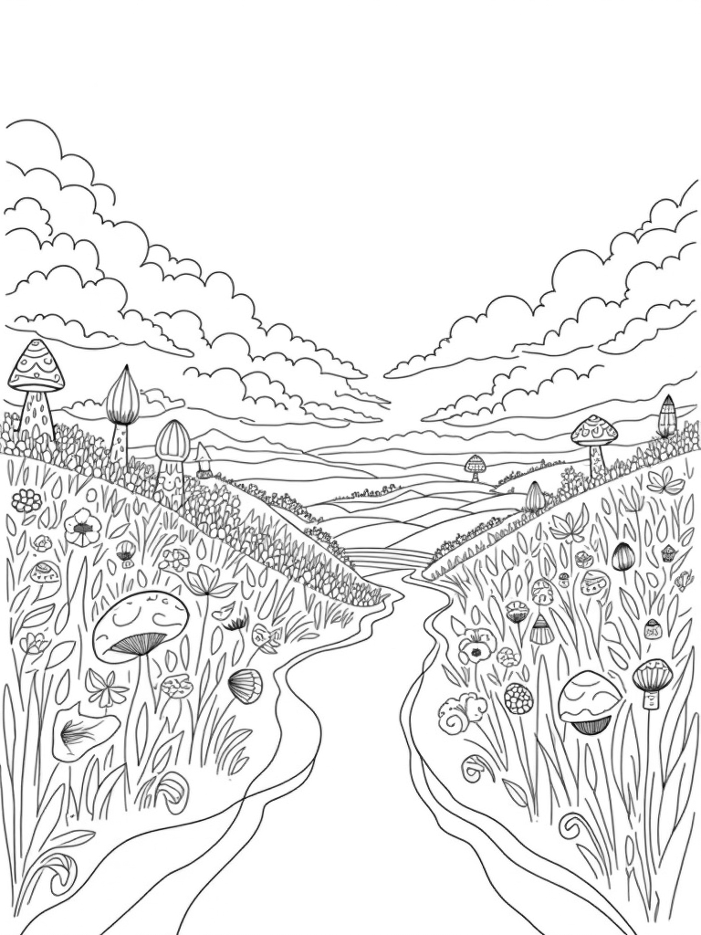Colorful Hilltop with Whimsical Flowers and Giant Mushrooms Coloring Page