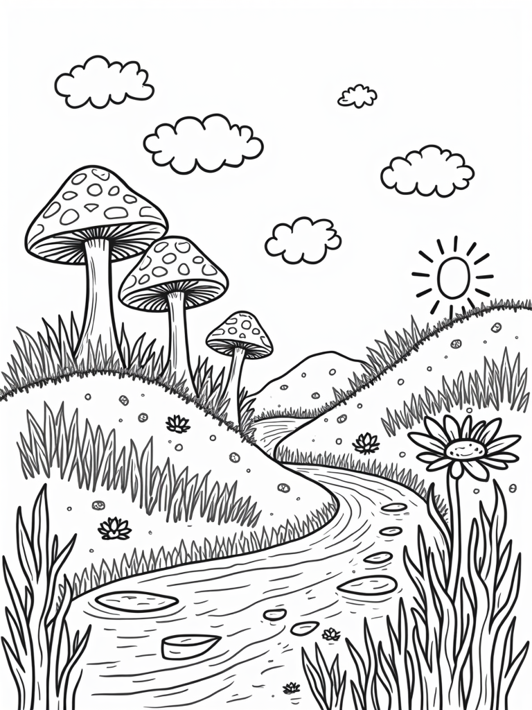 Colorful Mushroom Hillside with a Winding River Coloring Page
