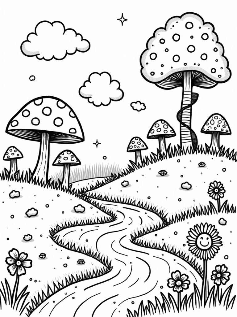 You’ll find an enchanting hillside filled with oversized mushrooms that look like vibrant umbrellas! Each mushroom has its own unique patterns of polka dots and stripes, making them super fun to color. A gentle stream flows right through the center, winding around smooth pebbles and twinkling like stars in the night sky.