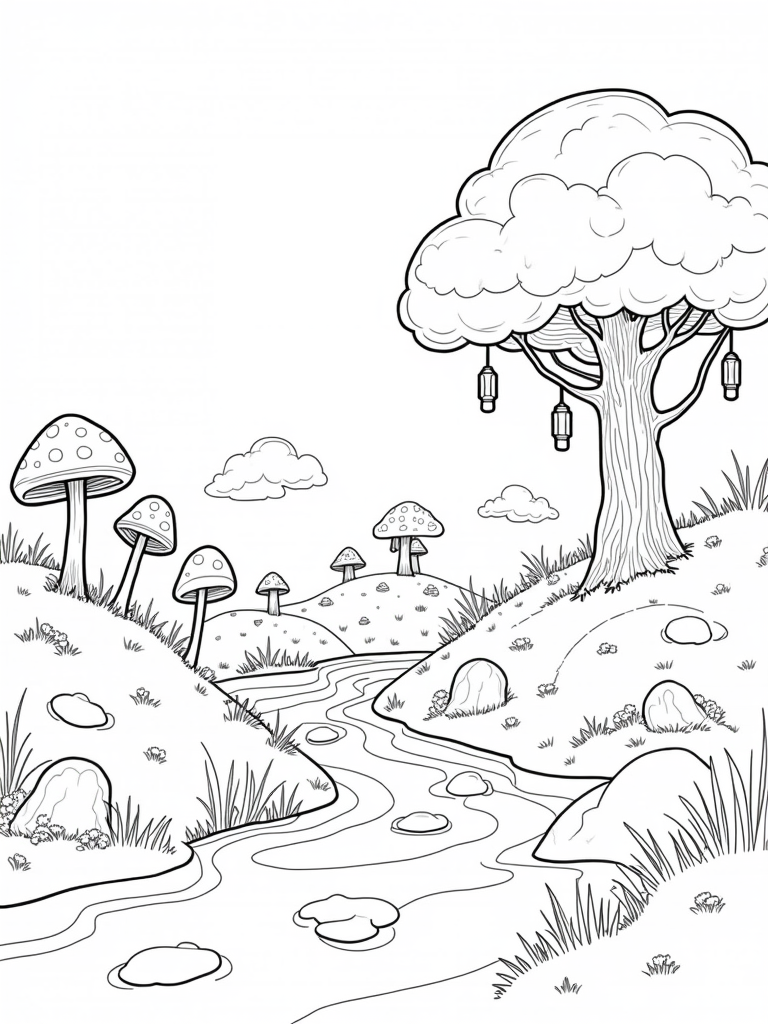 Check out this free printable coloring page featuring a whimsical landscape with colorful mushrooms, a gentle river, and friendly clouds. Perfect for kids who love to color and explore their creativity!