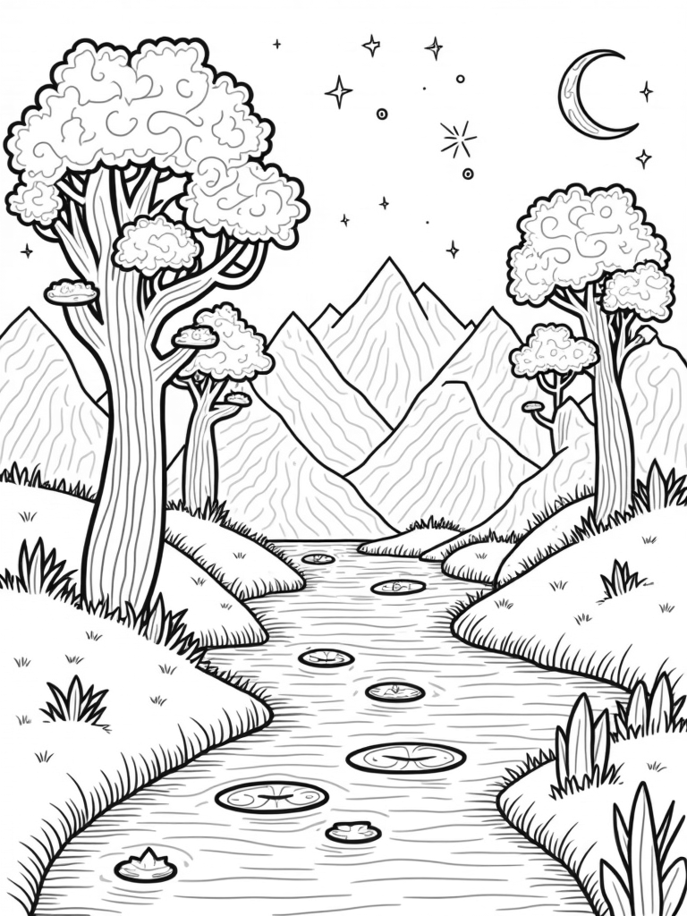 Check out this free, printable coloring page featuring a quirky landscape with colossal trees, a winding river, and a crescent moon! It’s perfect for kids who love to color and explore imaginative scenes. Grab your crayons and start your creative adventure with this fun landscape!