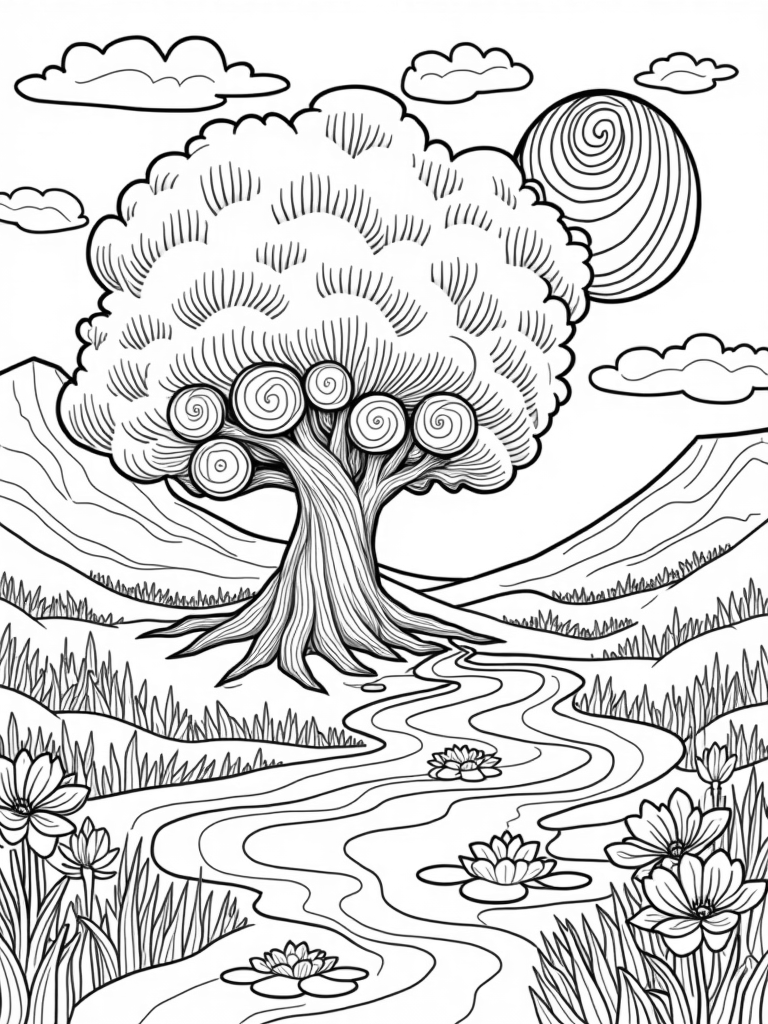 Colossal Tree with Planet Fruits and Colorful River Coloring Page
