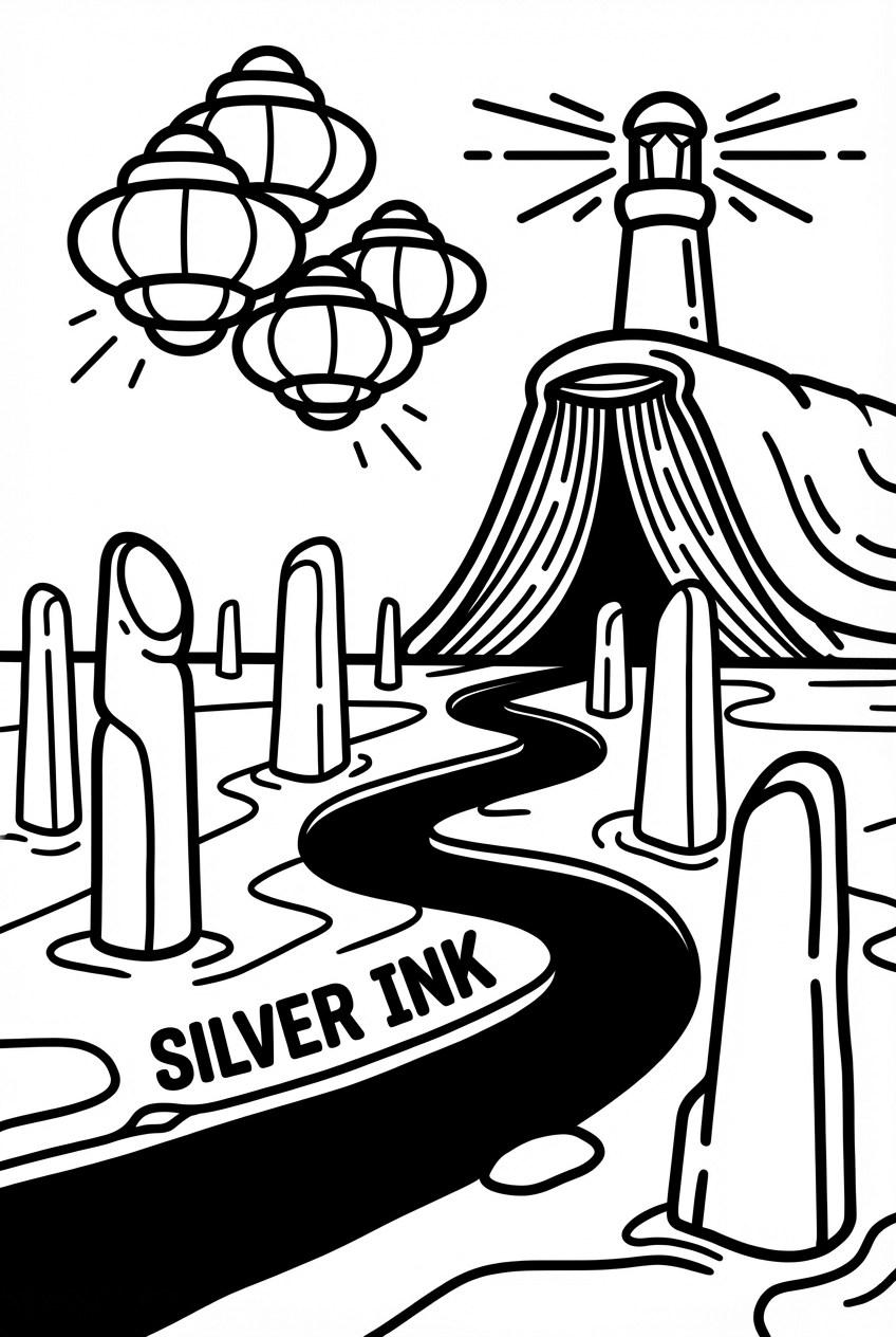 You could give the glass plain a cool blue or keep it pale for a dreamy vibe. The stone pillars love earthy tones—think soft grays or warm browns. The ink river is a great chance to experiment with metallic crayons or silver markers for that shiny look. For the lighthouse, try pastel rainbow hues or even a bold single color to make it pop. And those lantern clouds? Light yellows or pinks work nicely, or you could go all night‑sky with deep purples and tiny white dots for stars.
