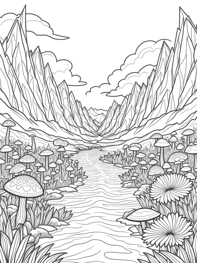 Crystal Mountain Landscape with Flowing Glass River Coloring Page