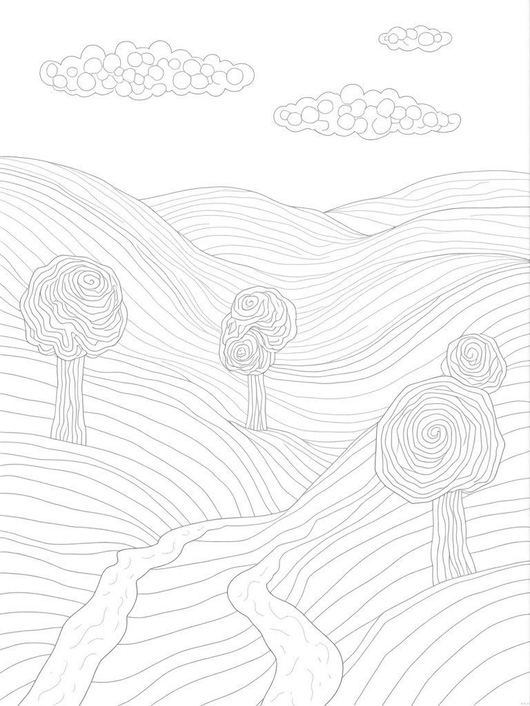 Dreamlike Landscape with Rolling Hills and Abstract Trees Coloring Page