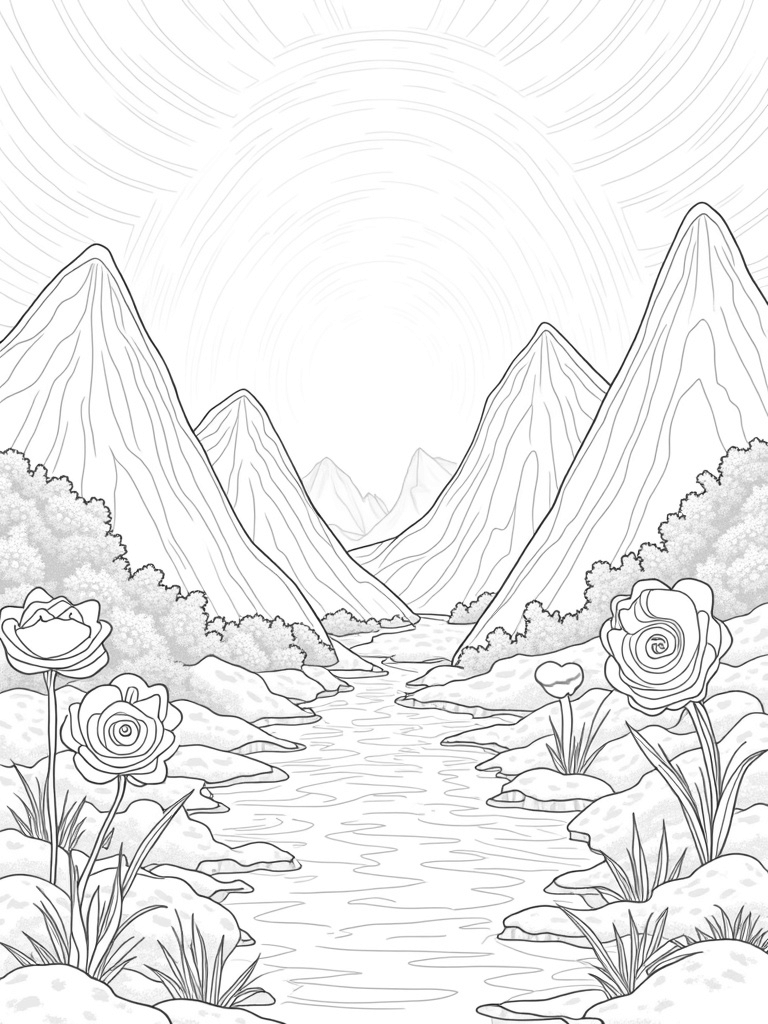 Dreamlike Valley with Geometric Mountains and Floating Islands Coloring Page