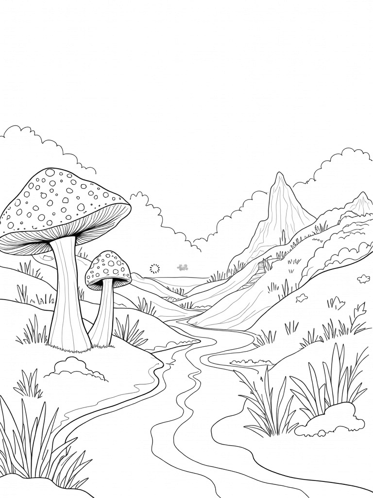 You’ve stumbled upon a magical landscape filled with oversized mushrooms that seem to dance atop a gentle hillside. Each mushroom cap is adorned with intricate geometric patterns, inviting you to bring them to life with your favorite colors. Just beside them, a winding river sparkles like a million stars, reflecting sunlight in a way that makes it look like a shimmering ribbon flowing through the valley.