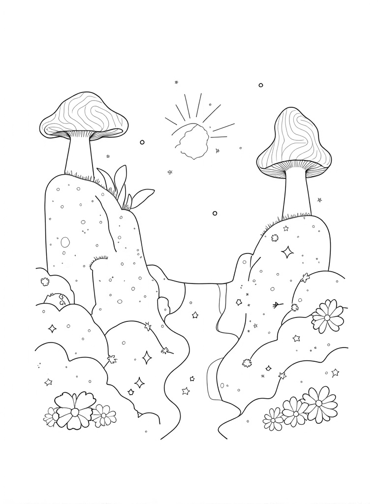 In the foreground, you’ll find a winding river made of shimmering stars, flowing gently around smooth boulders. It’s like a dream come to life! Plus, there are some oversized flowers scattered around, each with petals shaped like geometric designs. Can you imagine all the colors you could use?