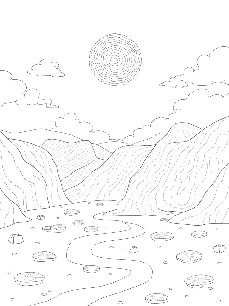 Picture this: a huge landscape filled with giant, geometric hills that look like they popped out of a dream! Each hill is covered in cool patterns of lines and shapes, just waiting for you to bring them to life with color. In the foreground, a winding river flows gracefully, like a shiny ribbon. You’ll find oversized lily pads that resemble vibrant mandalas, perfect for adding splashes of color.