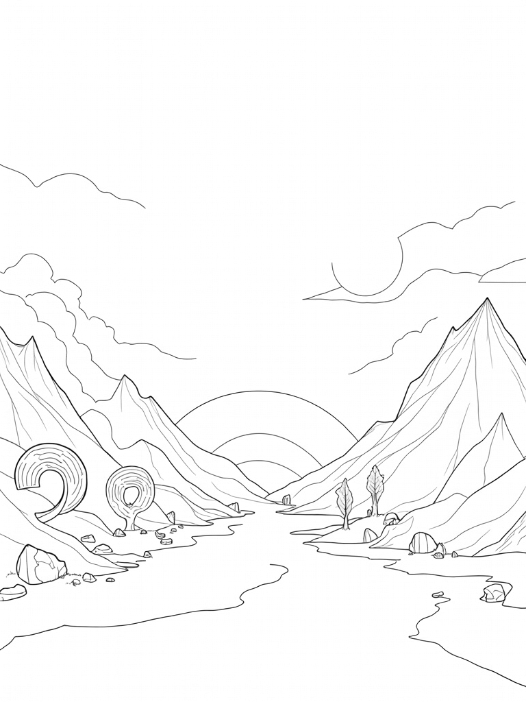 In this vibrant landscape, giant, geometric mountains rise sharply against a swirling sky that seems to dance with color. The foreground features a river of liquid glass winding through the terrain, reflecting the bright hues above. You’ll spot oversized, spiral-shaped trees standing tall at the water's edge, their trunks twisting into fascinating patterns. Don’t miss the oversized pebbles along the riverbank, each etched with intricate labyrinth designs that are just waiting for your creative touch.
