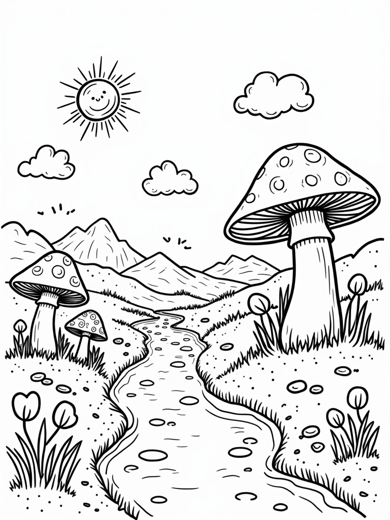 This scene is perfect for letting your creativity shine! As you color the mushrooms in all sorts of wild colors, think about what kind of creatures might live under them. And don’t forget that cheerful sun peeking from behind the mountains—what colors will you choose for its smile? The oversized pebbles scattered around are just waiting for your artistic touch. Will they be polka-dotted, striped, or something totally unique?