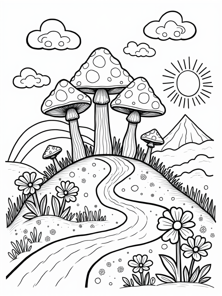 Check out this free, printable coloring page featuring a whimsical landscape with giant mushrooms, a sparkling river, and friendly flowers. Perfect for kids who love to color and bring a magical hilltop scene to life!