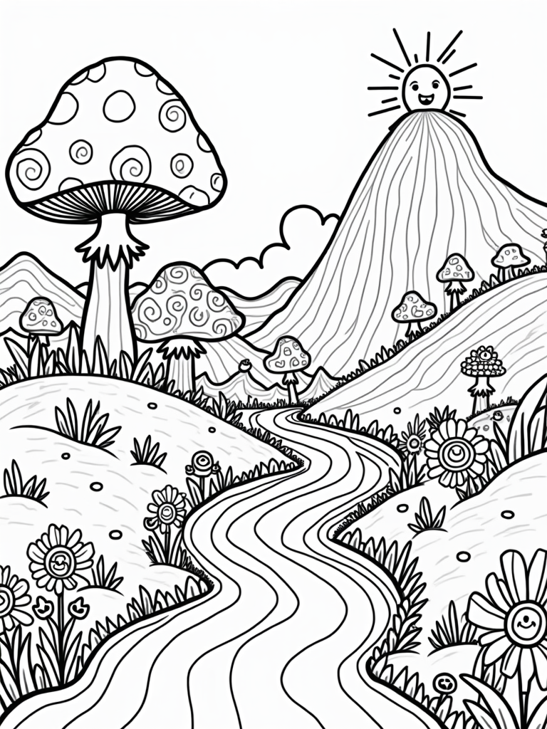 Check out this free, printable coloring page featuring a whimsical landscape with giant mushrooms, a rainbow river, and a cupcake mountain. Perfect for kids, it’s a fun way to spark creativity and enjoy some coloring time!
