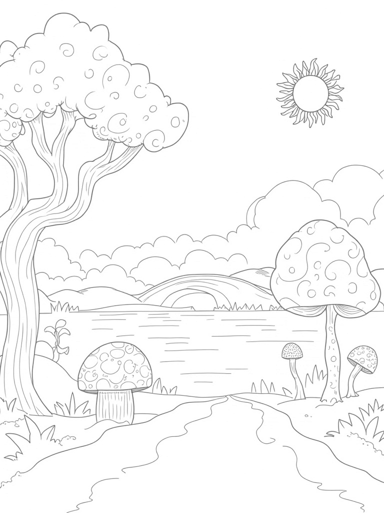 Check out this free, printable coloring page featuring a whimsical landscape with giant trees, oversized mushrooms, and a magical river. Perfect for kids who love to color and explore their creativity with fun designs!