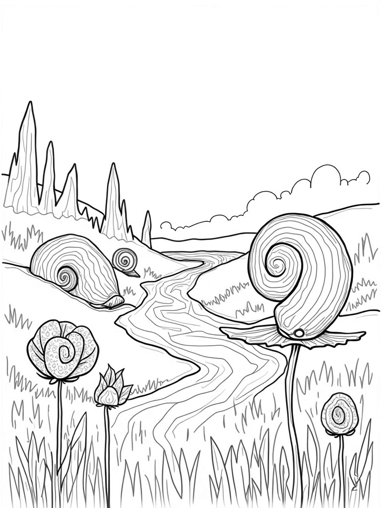 Imagine a magical hillside filled with giant, spiraled snail shells that are just waiting for your favorite colors! Each shell has its own unique patterns, making it a fun challenge for your creativity. Below, a shimmering river of molten glass flows gently, mirroring the sky's colors. On one side, sharp, crystalline rock formations stand tall, while the other side slopes down into soft, fluffy clouds that look like they’re ready for a nap.