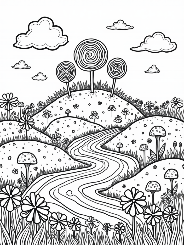 Hilltop of Lollipops and Rainbow River Coloring Page