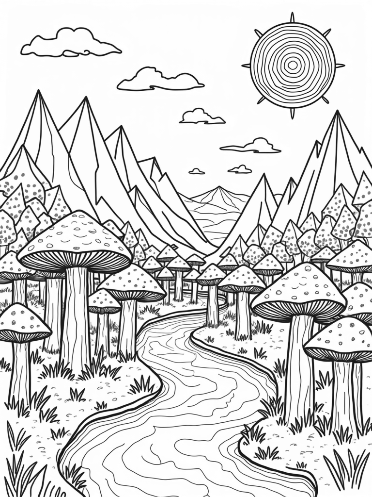Get ready to color a magical scene filled with oversized mushrooms that have colorful caps! These mushrooms create a cozy canopy above a sparkling river that winds through the landscape like liquid silver. In the background, you’ll see towering crystal mountains that sparkle in the sunlight.