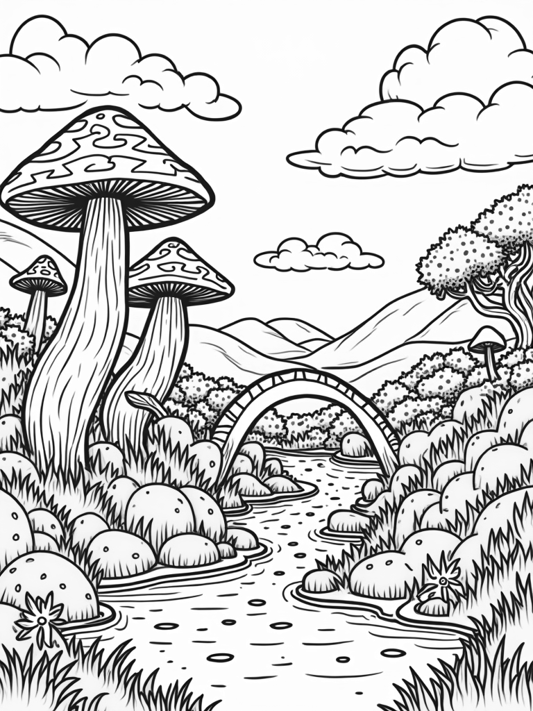 Magical Mushroom Landscape with Sparkling River Coloring Page