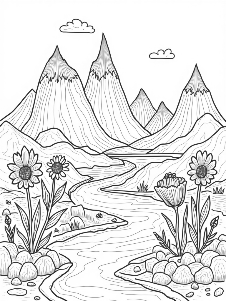 Mountain Peaks Made of Pencils with a Colorful River Coloring Page