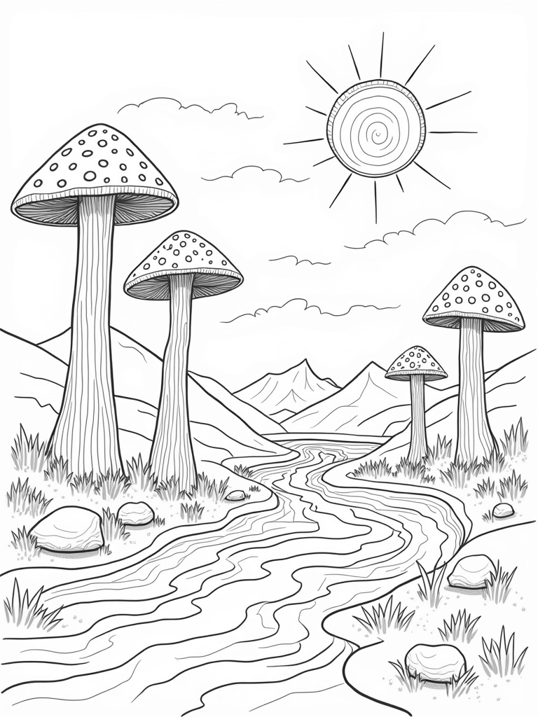 With the oversized sun sending out its twisty rays, this landscape is a perfect canvas for your creativity. You can use any colors you like—bright reds for the mushrooms, blues for the river, and even a rainbow in the sky! Let your imagination go wild!
