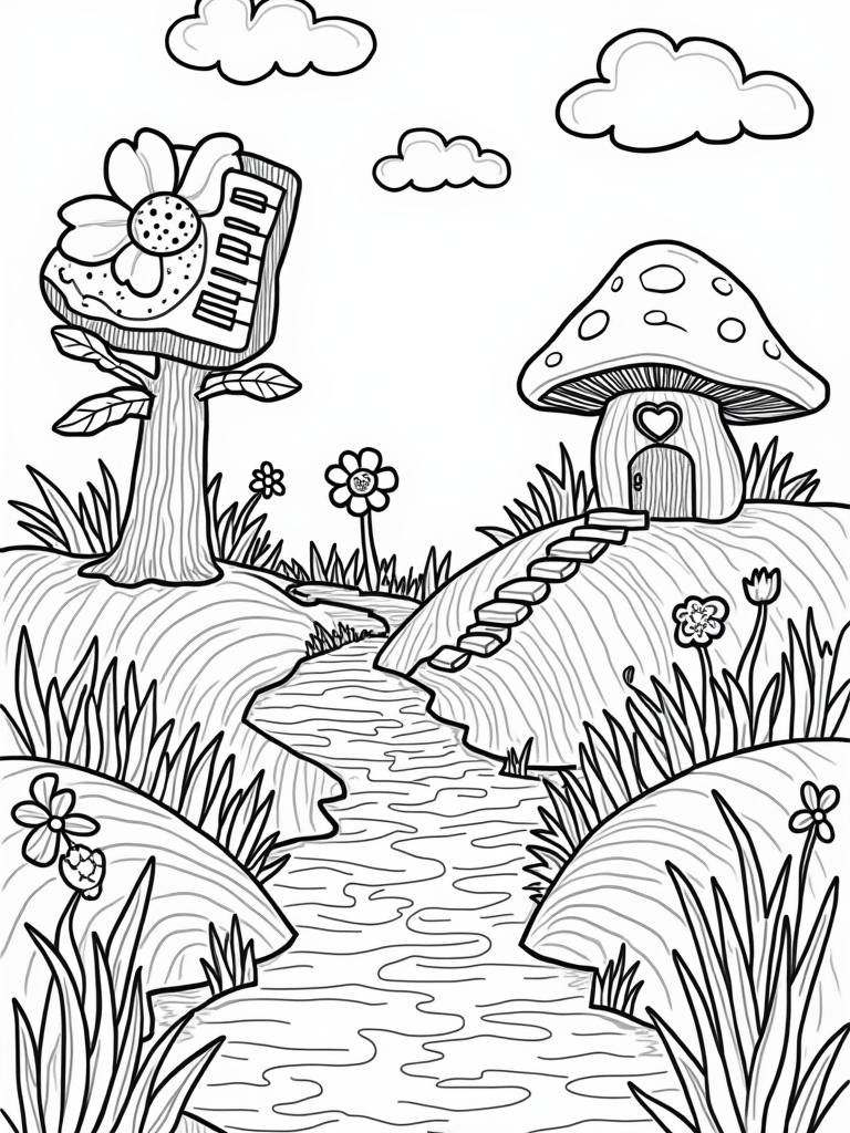 As you color, don’t miss the sparkling river flowing nearby, filled with rainbow-colored water that dances in the sunlight. Fluffy clouds shaped like smiling animals float above, making the sky even more cheerful. A winding path of stepping stones leads to a giant mushroom house that has a heart-shaped door—perfect for your imagination to wander! This garden is a place where music and nature blend beautifully.