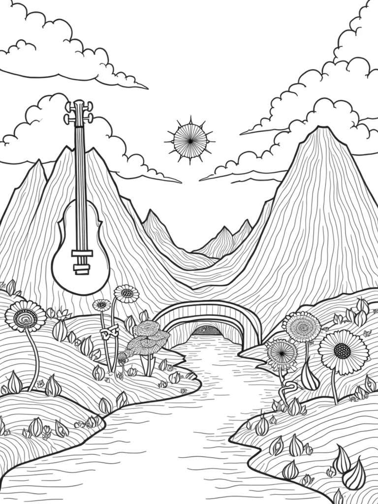 This scene is like a dreamland where music meets nature! You’ll find towering mountains shaped like guitars and trumpets, all cradled by giant, swirling clouds. A river of vibrant paint flows right through the middle, making it look like a rainbow spilled its colors across the landscape. There are patches of grass made from colorful yarn, which is just as fun to imagine as it is to color!