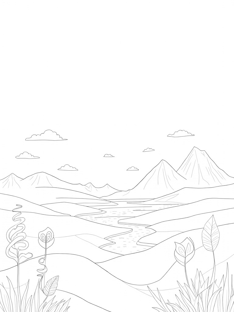 Check out this free, printable coloring page featuring a stunning landscape with twisting trees, oversized flowers, and crystal-like mountains. Perfect for creative kids who love to color! Dive in and let your imagination run wild.