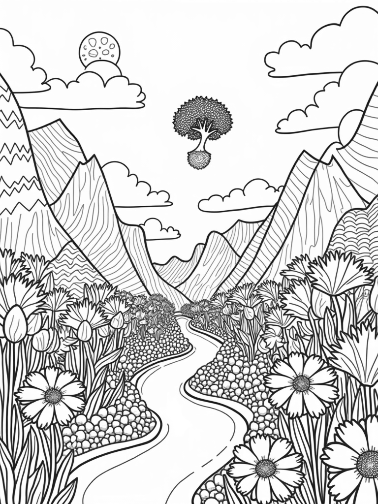 This page showcases a delightful valley bursting with oversized flowers that seem to reach for the sky. Their spiraling petals look like cheerful sunbursts, inviting you to add your own splash of color. A lovely winding river flows gently through the scene, bordered by smooth, patterned stones that add a nice touch. Look up, and you’ll spot fluffy clouds taking on the shapes of mountains, each uniquely decorated with stripes and dots!