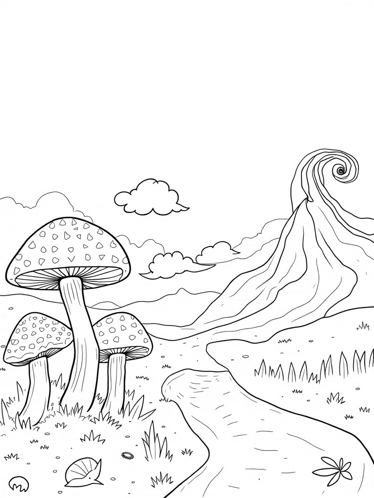Oversized Mushrooms and a Crystal River Landscape Coloring Page