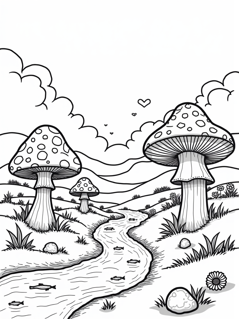 Oversized Mushrooms and a Playful River Coloring Page