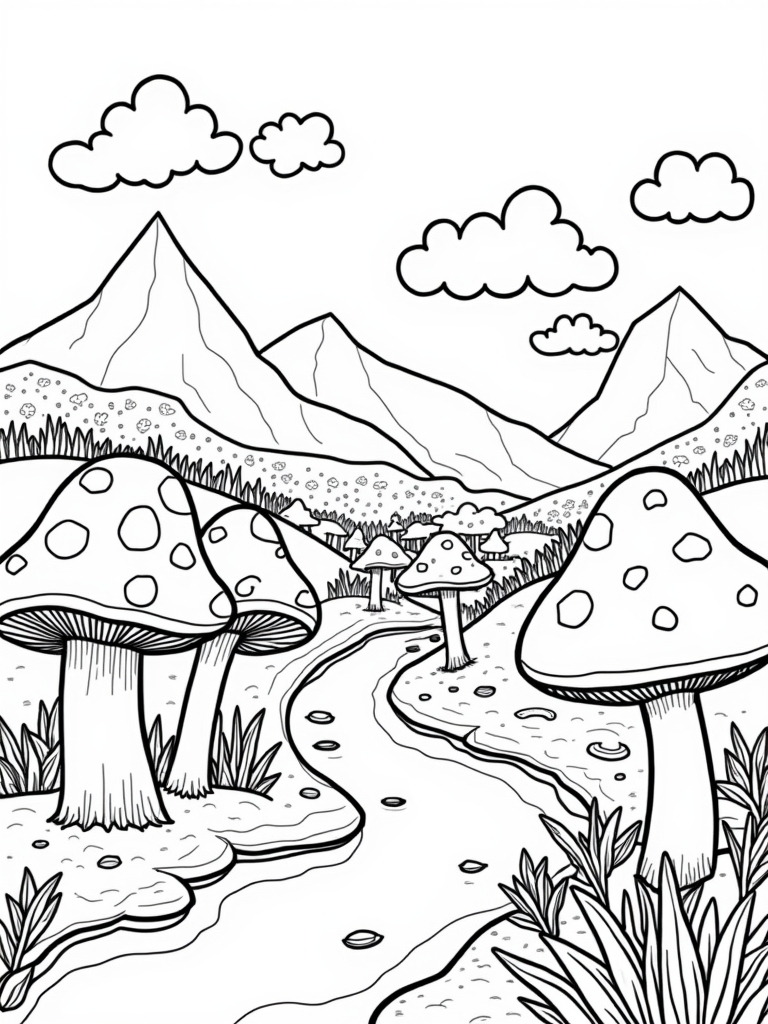 As you color this whimsical landscape, don’t forget the cluster of cheerful flowers near the riverbank. Their spiraled petals bring a pop of color to the serene setting, making it even more delightful. The combination of the vibrant mushrooms and the dreamy sky will spark your imagination, so grab your favorite crayons or markers and let your creativity flow!