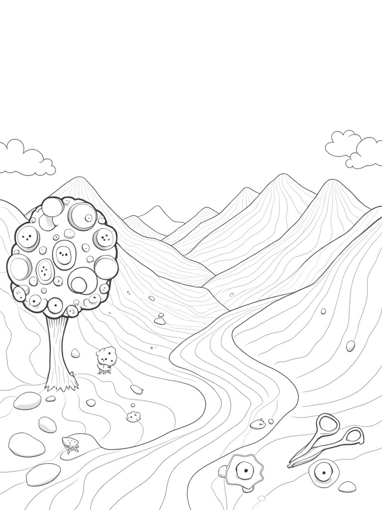 Flowing through this vibrant scene, you'll find a river made of swirling thread. It weaves its way around smooth pebbles and even has some delicate scissors resting on the banks. What a fun way to get creative with your colors! You could choose to color the river in all sorts of bright shades!