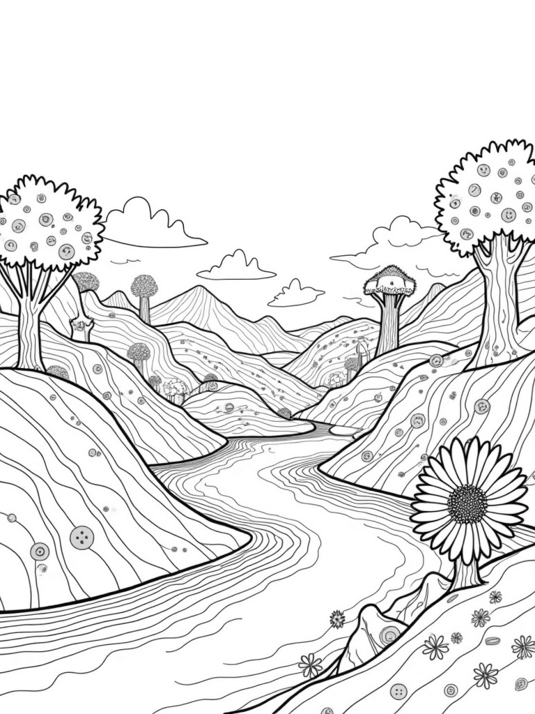 Check out this free, printable coloring page featuring a whimsical landscape of patchwork hills and paintbrush trees. Perfect for kids who love to color and get creative!
