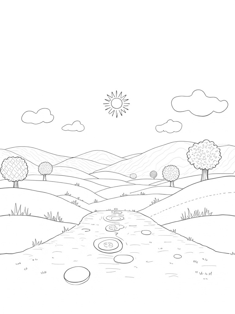 Look up, and you’ll see fluffy clouds shaped like cotton balls floating in the sky. They add a cozy touch to this whimsical world. The sun, crafted from woven straw, beams down and casts playful shadows across the rolling hills. It’s a perfect day for a coloring adventure, where you can bring this delightful landscape to life with all your favorite colors.