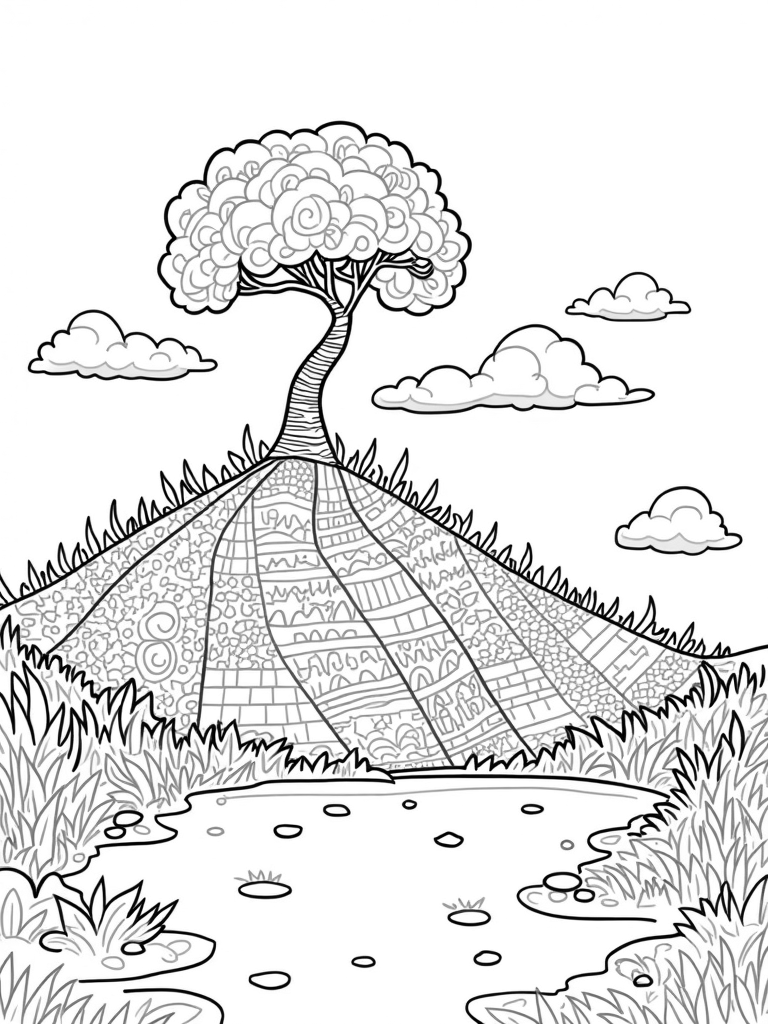 Quilted Hillside with Spiraling Tree and Tranquil Pond Coloring Page